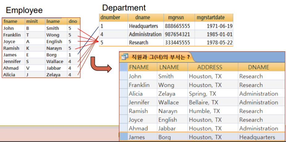 *DNUMBER=DNO는 DEPARTMENT와 EMPLOYEE 테이블을 결합하는 조인조건임