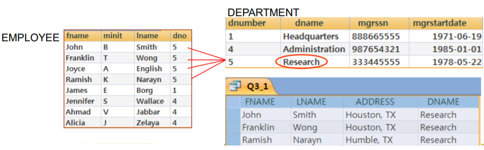 *WHERE절에서 DNAME="Research"는 DEPARTMENT에서 연구부서를 선택한 것
