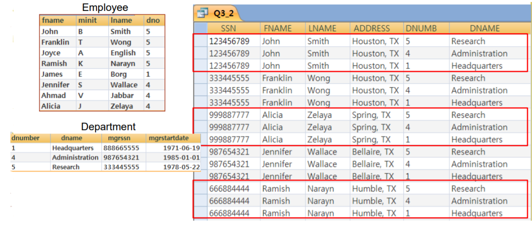 FROM (EMPLOYEE AS E INNER JOIN DEPARTMENT AS D ON E.DNO = D.DNUMBER);
