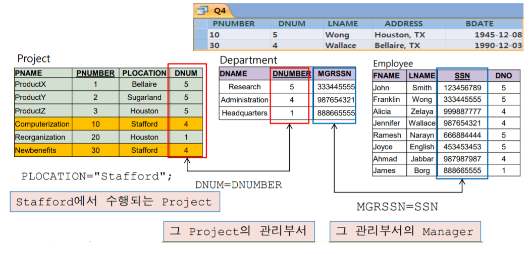 WHERE DNUM = DNUMBER AND MGRSSN = SSN AND PLOCATION = "Stafford";